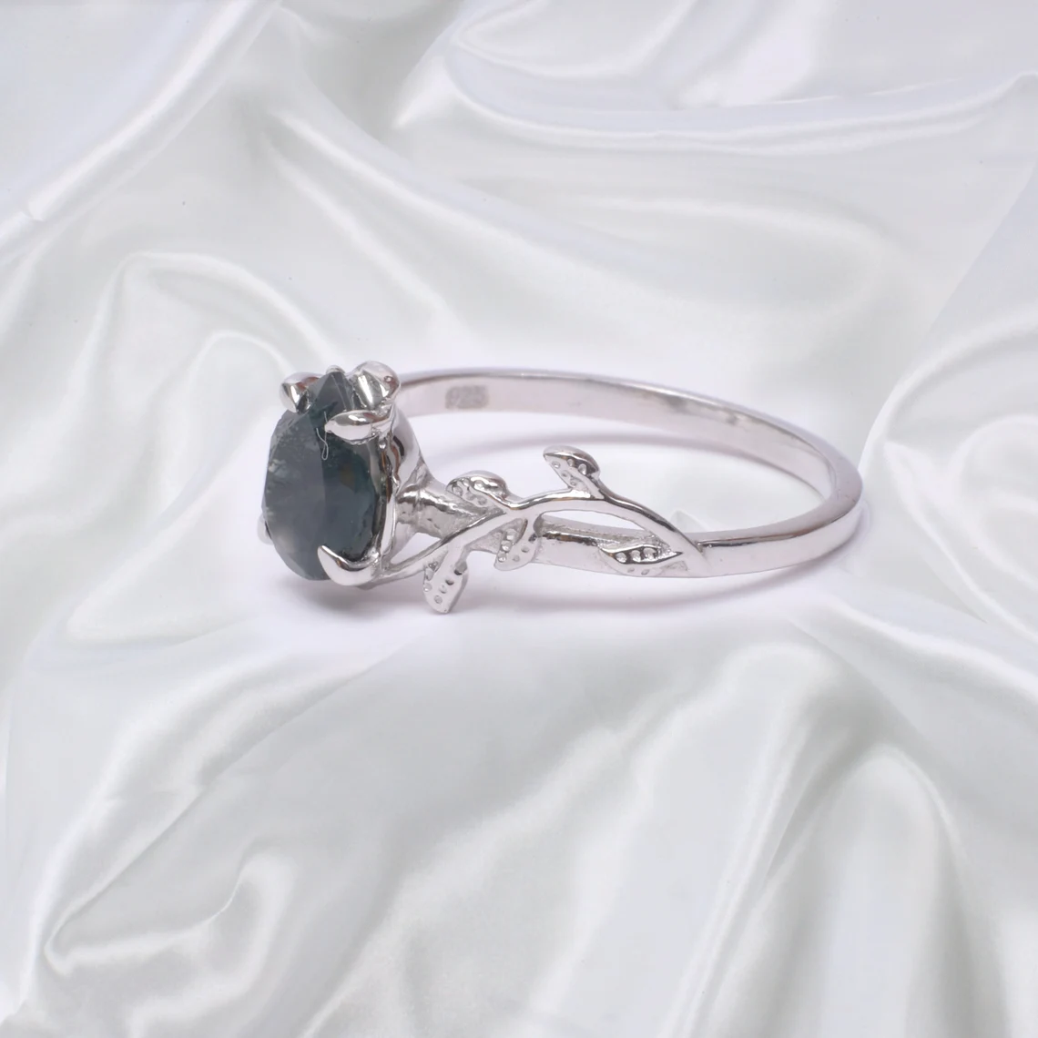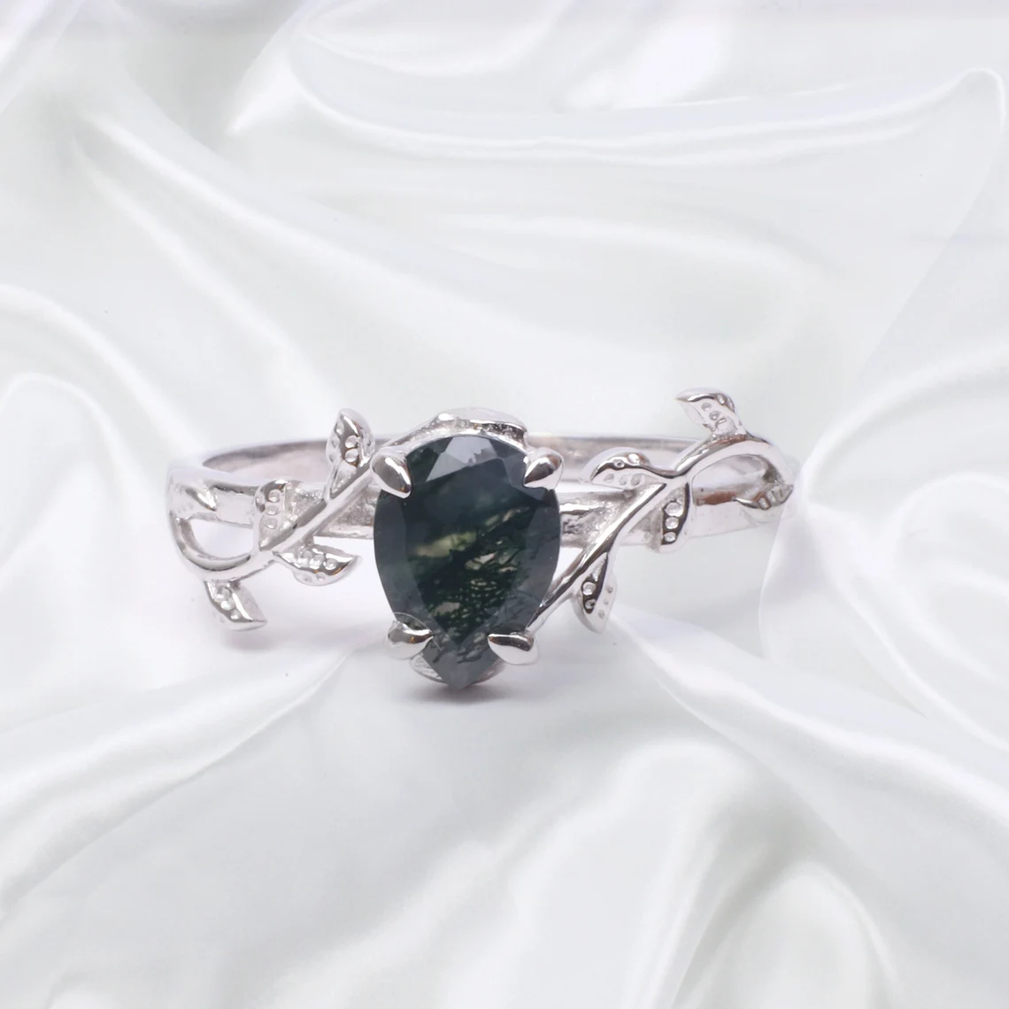 Moss Agate Ring Leaf Designer Ring Vintage Green Gemstone Engagement ring 14k White gold Gift for women Bridal Jewelry Pear Shape Stone Ring